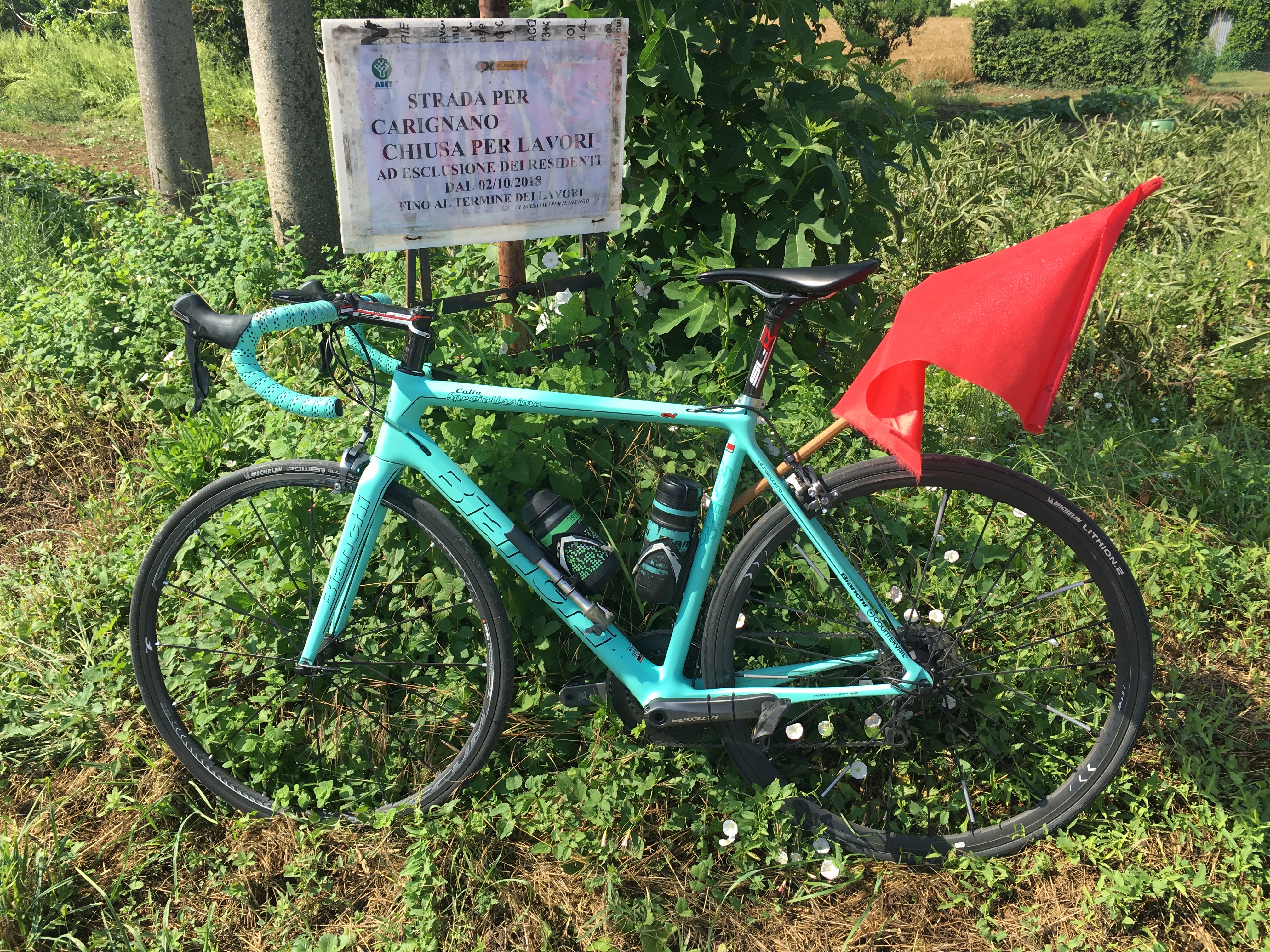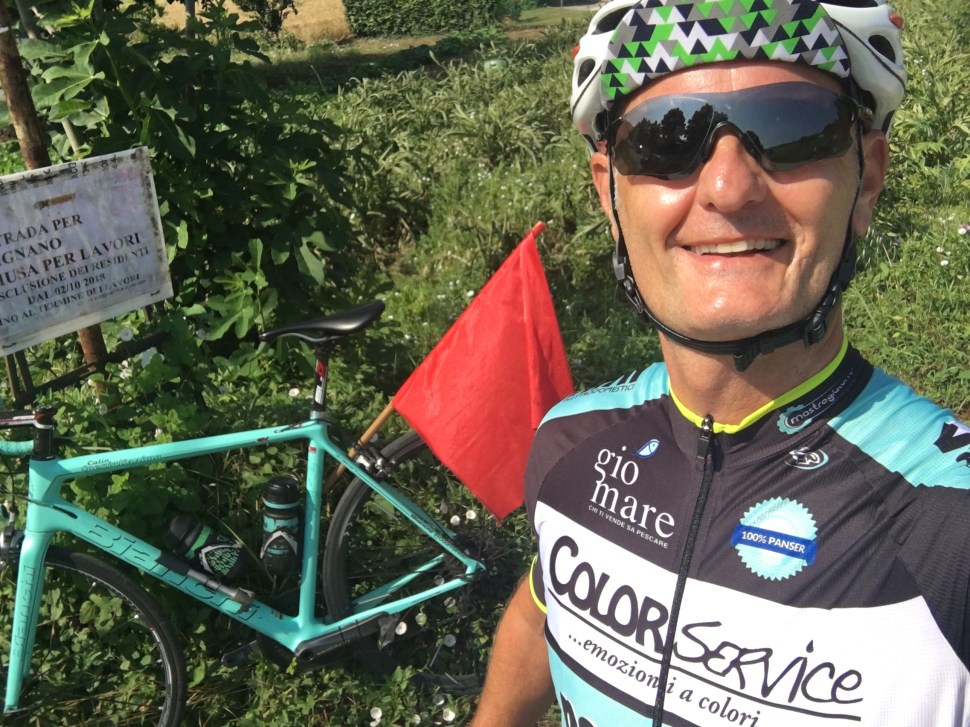 Thursday night I spent some time setting out cones for a cycling gymkhana for the little ones. Today I was a mobile marshal. I’m not sure the Italian term translates as well – not sure I should call myself a mobile escort. Armed with red flags, a number of us rode ahead of the group to block off junctions, wait for them to pass, then overtake the group to resume blocking duties. A rolling road block to accompany the two scooters from the Protezione Civile and the Polizzioti who stopped traffic in Fano.