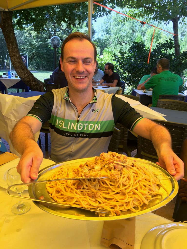 On to Cagli in the glorious sunshine for the biggest climb of the day. Not a steep hill, not a pass, not a long slow thigh burner but a mountain of spaghetti. Our destination was the locally famous Il Poggio restaurant. It’s famous for its carbonara. Not just the wonderful taste but the sheer size of the portions.