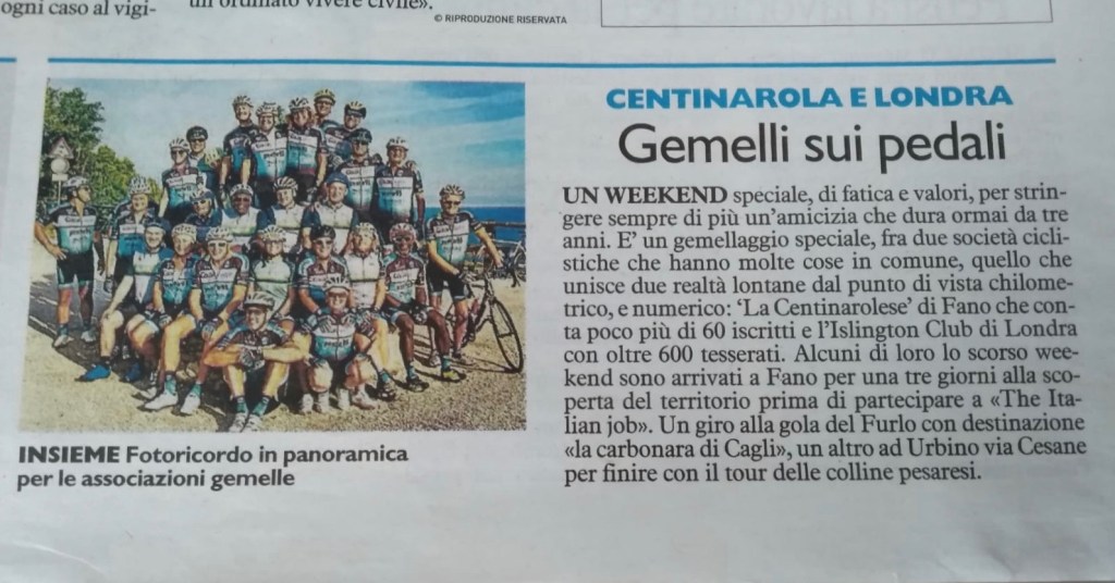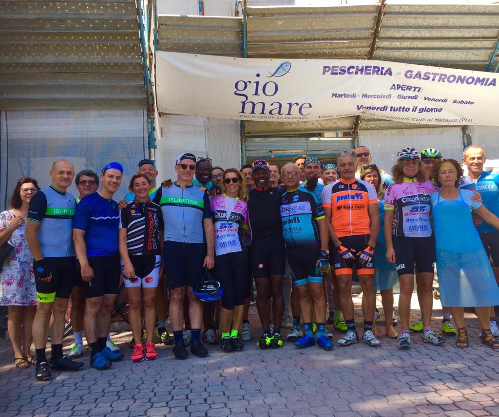 “We are very proud that six cyclists from London will join us for the ride: Andy Booth, Cliff Hall, Gino Murphy, Jyde Omotajo, Sean Wightman and Colin Fisher (who lives near Fano during the summer and London in the winter). The ride for “Gli Amici di Andrea” [the friends of Andrea] co-incides with the Twinning weekend between SCD Centinarolese and Islington Cycling Club. Every year Londoners come to Fano or the Fanese go to London to celebrate cycling, eating, drinking and friendship. “Amici e Bici” [Friends and Bikes] is their motto.”