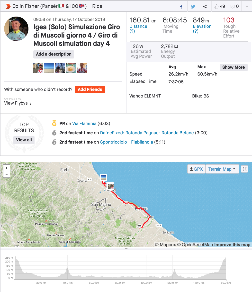 I managed the five days, completing 779km and 7k metres climbing but the Giro starts with 1,585km and 15k metres climbing over the first ten days before the only rest day. In short it was half of the first ten days and a third of the entire Tour. I will keep a base level of fitness during the winter then pick up the training during next spring in readiness for June. The Giro is going to be a tough challenge.