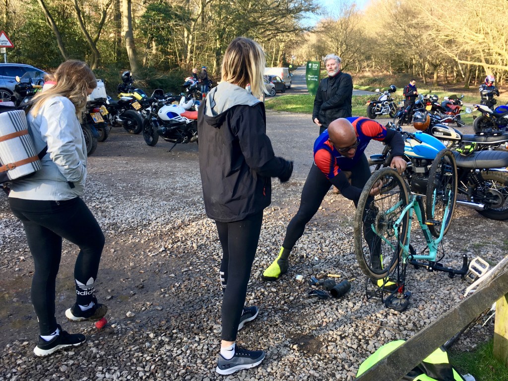 At lunch AJ spotted a couple of damsels in distress. Both on bikes, one with a puncture and no kit to repair it. Our hero stepped up and repaired the flat.