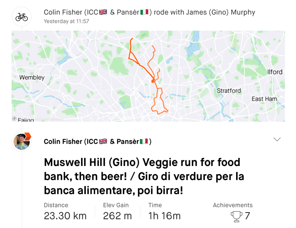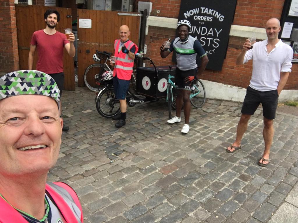 The second valedictory was my final food bank collection run. I posted that it would be my last for some time and offered to buy a round in the same pub as the day before, The Gatehouse in Highgate. Gino stepped up to be my outrider and Alessandro, Cliff and Dave dropped by for a drink.