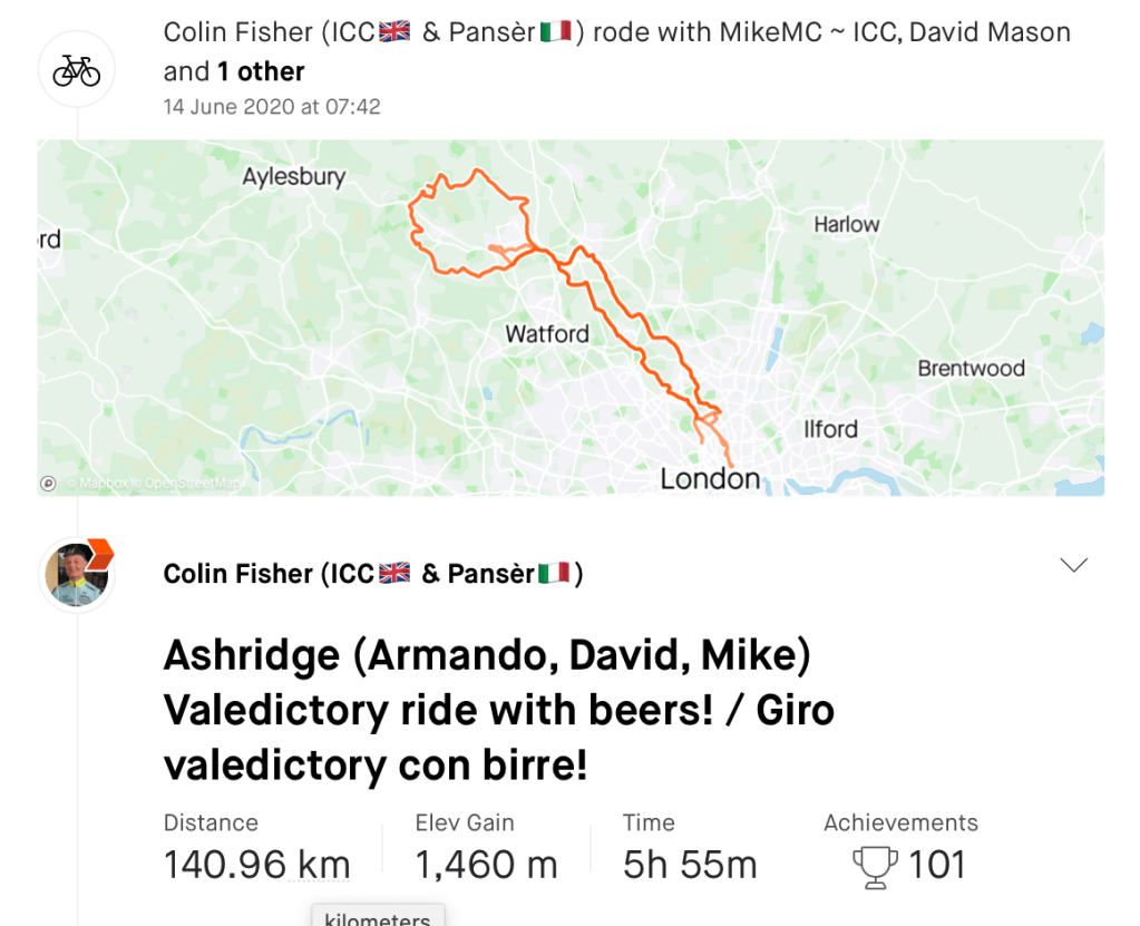 The uncertainty justified two valedictory rides. Sunday with Armando, David and Mike. A 140km ride through the Hertfordshire and Buckinghamshire countryside on a warm day. As we’re normally in Italy in the summer I only get to ride these lanes in the winter. I’ve often said I’d like to ride them in the summer. A gift from Covid-19.