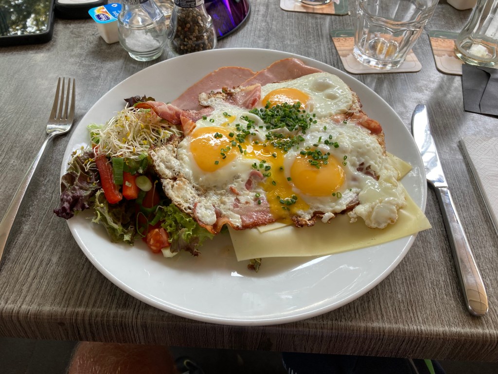 An unusual event for me. A full lunch stop. My Dutch companions explained the options. Most of them opted for the eggs. “It’s eggs” explained one. I ordered the same. They called it lunch, I called it breakfast.