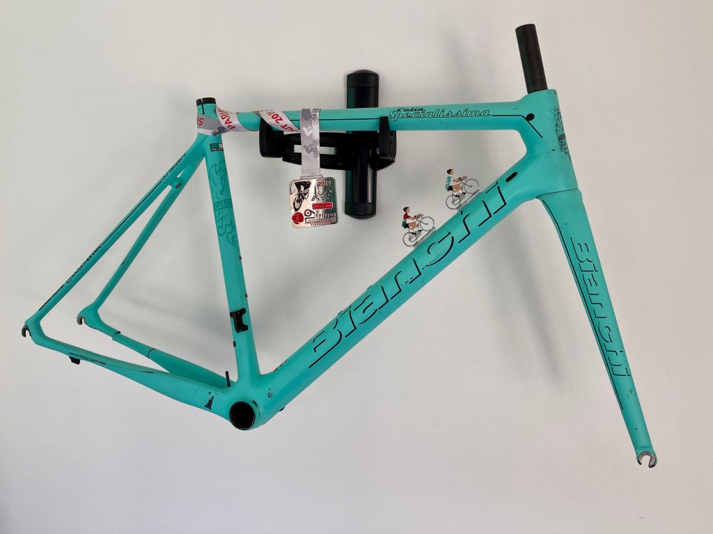 Allegra I now hangs on the wall adorned with my PBP 2019 medal and two metal figures given to me by Ron Gravendeel for the Giro di Muscoli 2020.