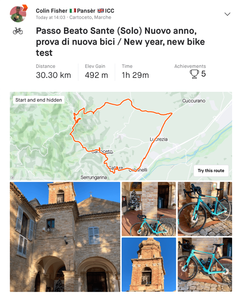 On the flat I just couldn’t get it going. Turning the bike uphill it didn’t feel any better. I could see Passo Beato Sante ahead if me. It’s 400m and within sight of home so a good test. I struggled at first but as I climbed and it got a little steeper it seemed to get easier. By the end of the ride I was feeling much better. I concluded that after an indulgent Christmas and not much riding the problem was with the rider, not the bike.