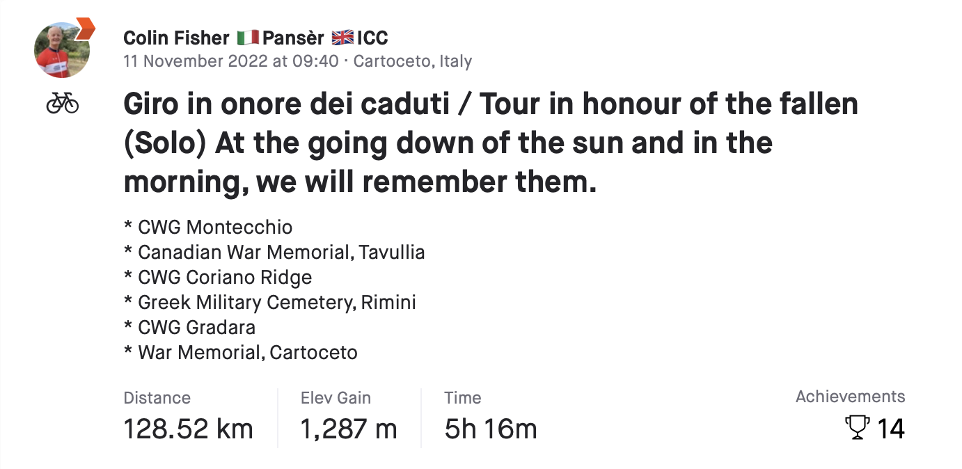 Photo: On the 11th hour (in the UK) of the 11th day of the 11th month I stood in silence for two minutes in San Giovanni in Marignano during my ride to honour the fallen.