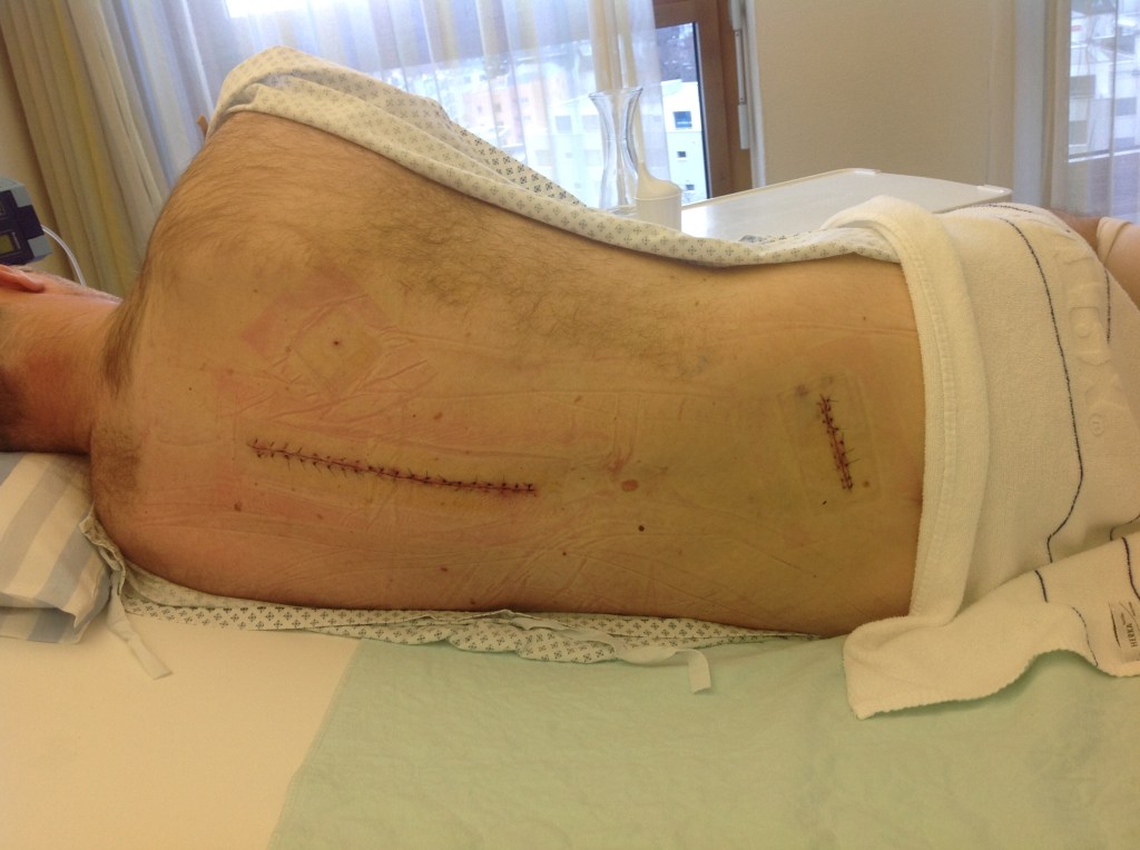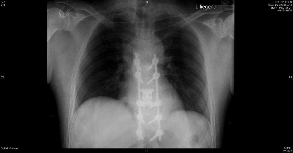 On the 21st January 2014 I had a skiing accident and broke my back. I destroyed my T9 vertebra. I was taken to the Kantonsspital in Chur for emergency surgery. Dr. Broger and his team spent 6 hours fitting a titanium cage to replace my vertebra and two poles to stabilise my spine. On the 22nd January Dr. Broger told me how incredibly lucky I was that not a single piece of my broken vertebra cut my spinal column. I was so very lucky not to need a wheelchair for the rest of my life.