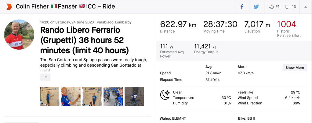 The Rando Libero Ferrario 600km, Milan – Zurich – Milan, 24th-25th June 2023 was to celebrate the centenary of Libero Ferrario becoming the first Italian cyclist to win the World Cycling Championship on the 25th August 1923 in Zurich. He was from Parabiago in Milan where the audax started and finished.
