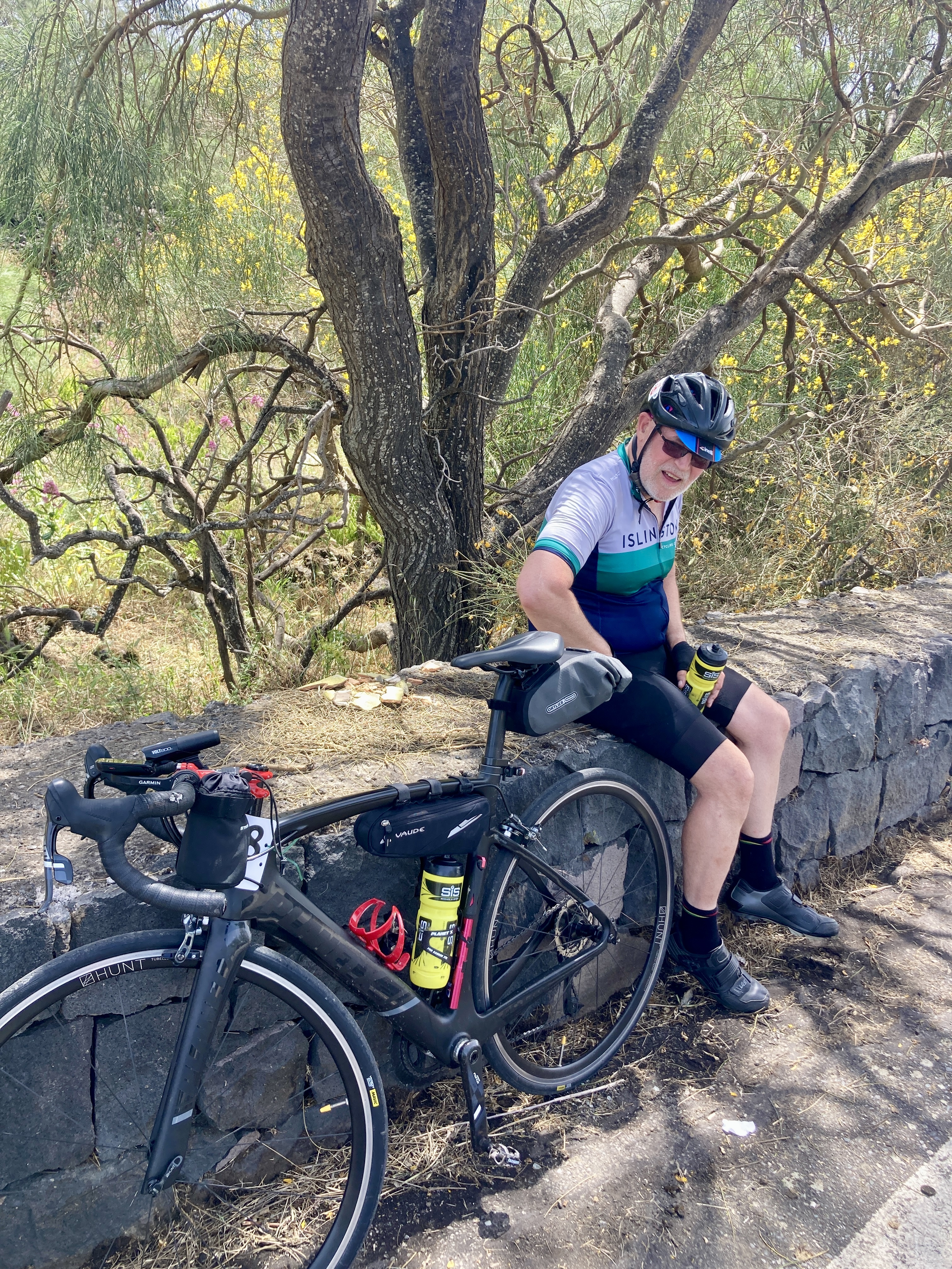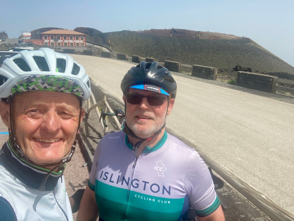 Then started the climb that made Mike wonder if he’d made the right decision to even attempt SNS. There were two factors that just didn’t apply to me but made Mike really struggle. The heat and the difficulty of training for a 1,900m climb when you live in Central London. We managed the first half ok but we both knew the second half would be much tougher. At the last water stop in Nicolosi we had 20km to go but 1,200m of climbing. If it was constant it would be exactly 6%, but it never is. The respite of any flat bits have to be paid for by steeper sections. I was fine but Mike really struggled. Having set himself a target of doing a 100m climbing at a time, he had to stop and rest each time. I felt for him. I couldn’t pedal for him but just had to watch my mate struggle and offer any encouragement I could think of.