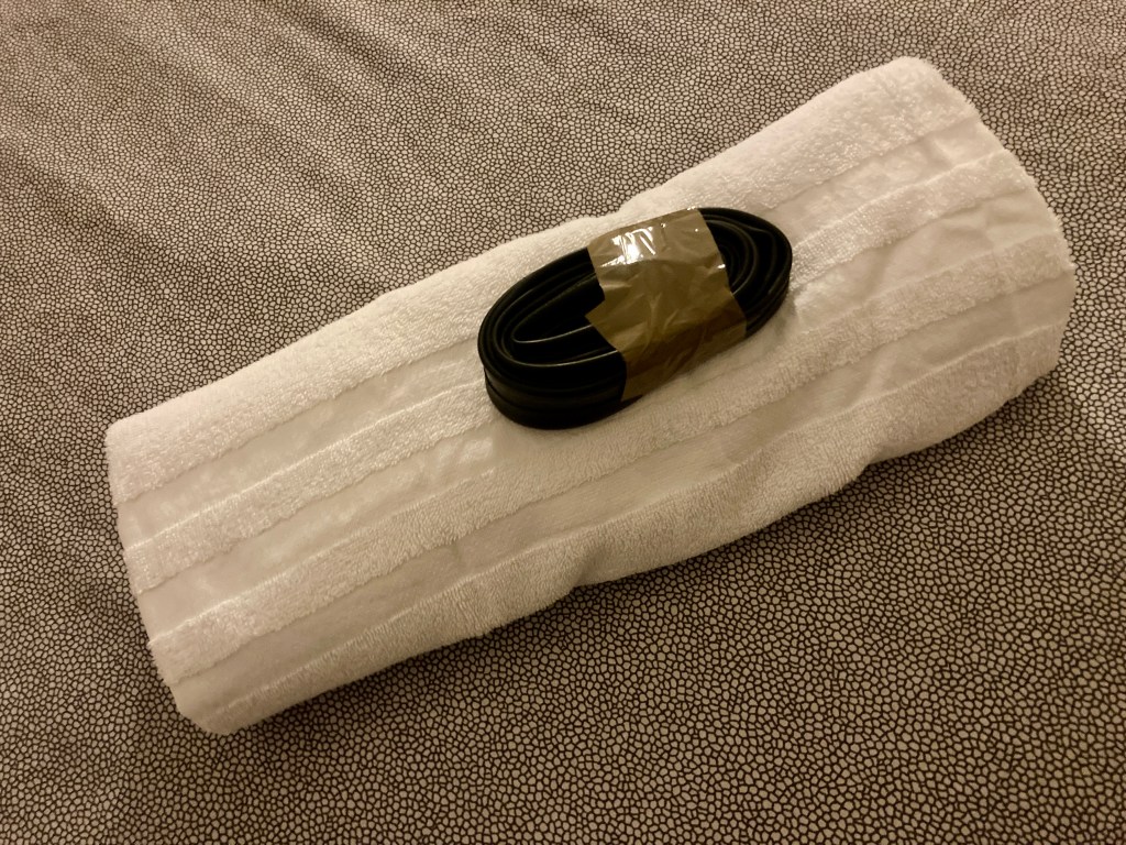 We arrived at the hotel at 03:16. Later than planned but Sod’s Law, no punctures. Waiting for me was a spare tube and CO2 in my drop bag and a little gift from Gabriel who’d left several hours before me. Thank you Gabriel.