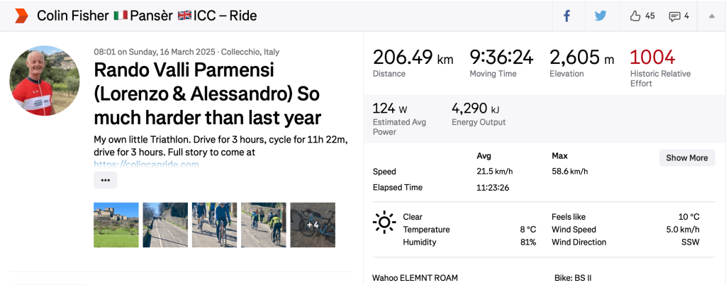 My thanks to the Filippelli Vecchia Parma cycling club for excellent organisation as always but especially to Lorenzo and Alessandro for all their help getting me round. If you want to see pictures of the various castles we visited then see my blog from last year’s event. I felt much better a year ago, I had time to take photos and still finished 2 hours quicker than I did this year: Rando Valli Parmensi 2024