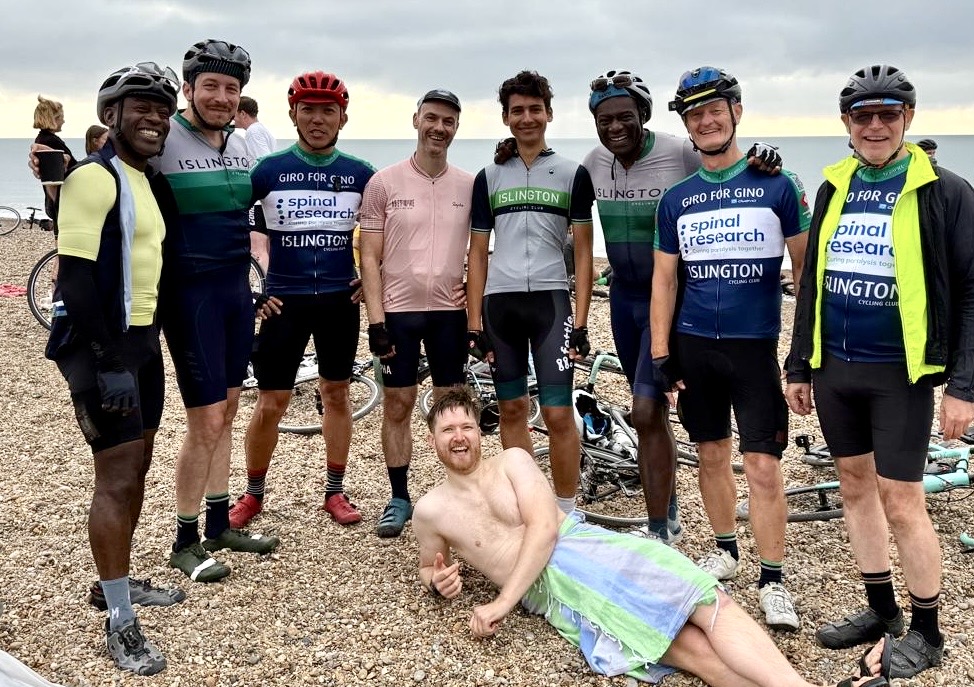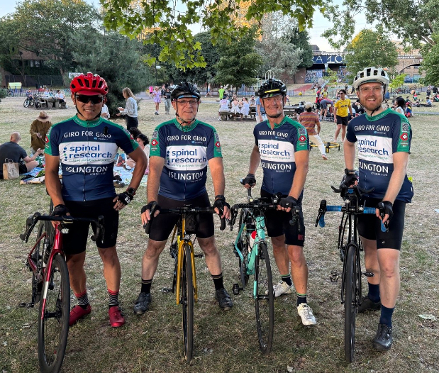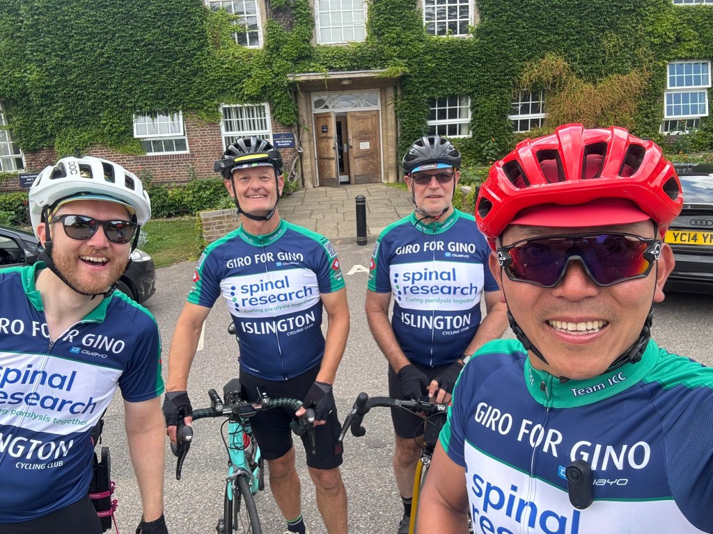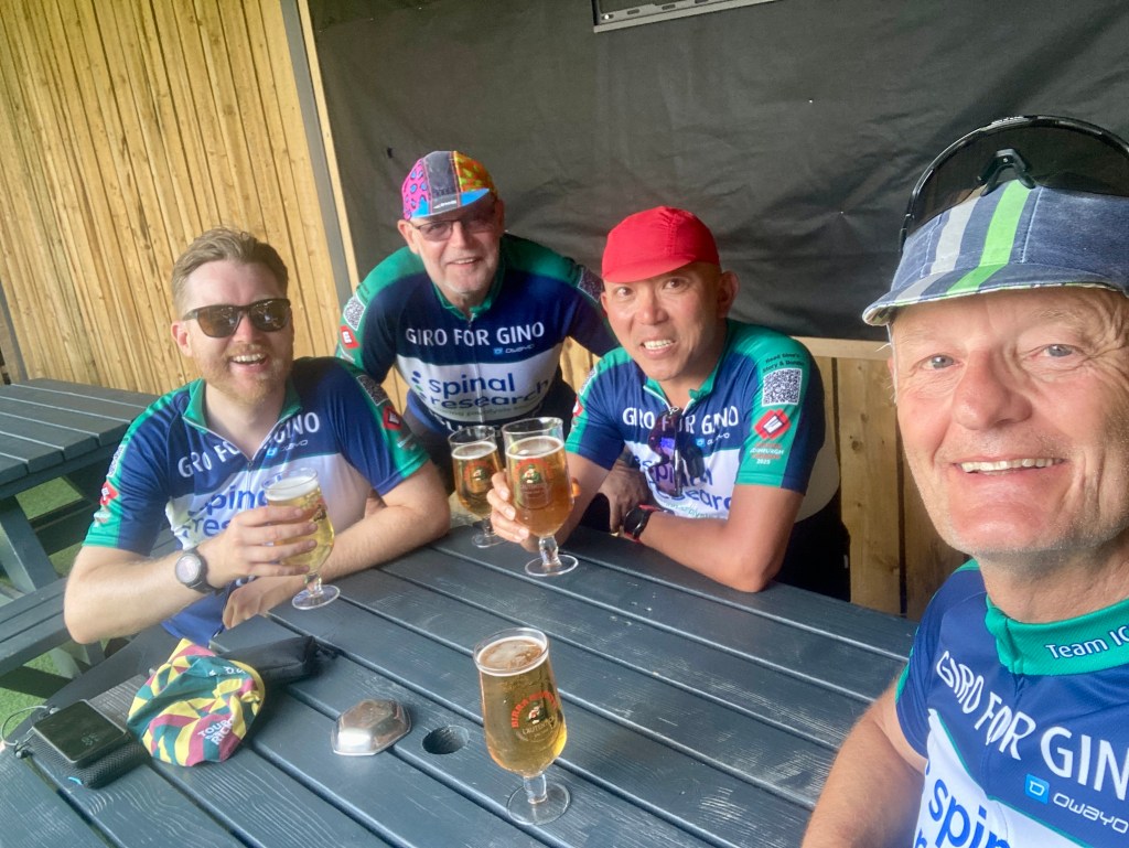 Four us wearing our Giro for Gino jerseys. The ones we’ll be wearing on London Edinburgh London on the 3rd August.