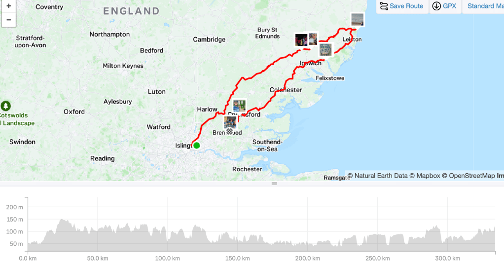 It’s a night ride from London Fields to Dunwich beach in Suffolk, 179 km away. I love the informality of it. There is no registration. No start time. Just turn up and start riding when you want to with a view to arriving at the beach for dawn/breakfast.