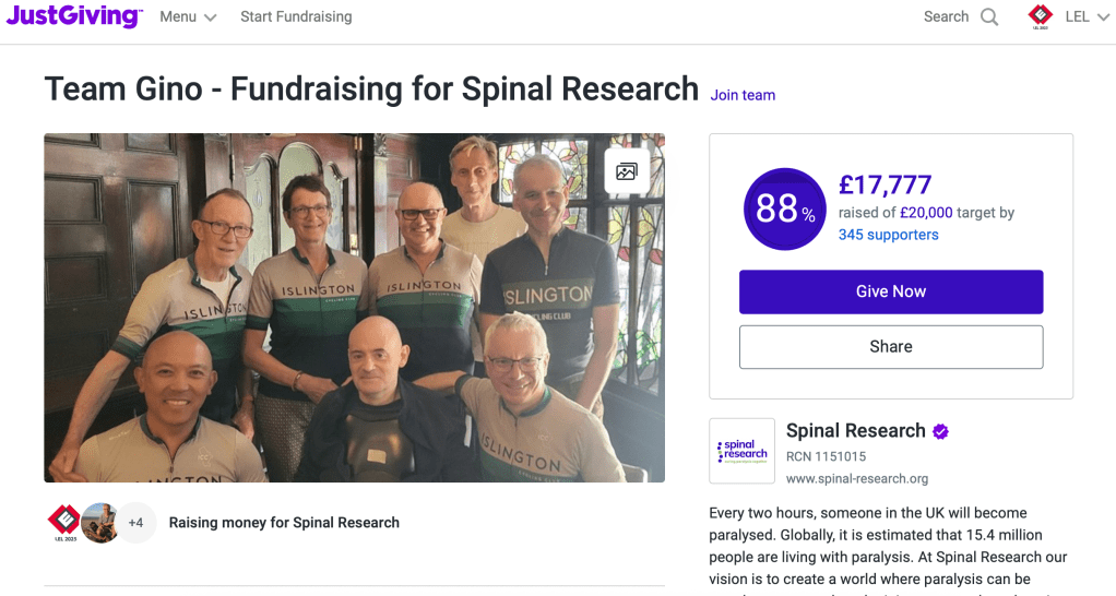 Perhaps more important was being part of the team that raised £17,777 in total so far for Spinal Research in Gino’s name. Gino fell from his bike in 2024 and is now paralysed from his chest down. We were going to raise money for Gino but he insisted we raise money for others. We’re still taking donations as we’re trying to get to our £20,000 target. Click below to find out more and make a donation if you wish. Thank you.